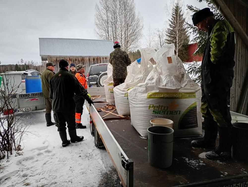 Kolme suursäkkiä riistaviljaa jaettiin Niskosen riihelle ja riistankäsittelytilan varastoon. Homma hoitu nopeasti ripeiden talkoolaisten voimin. Samalla vietiin majalla yksi kuora polttopuita.