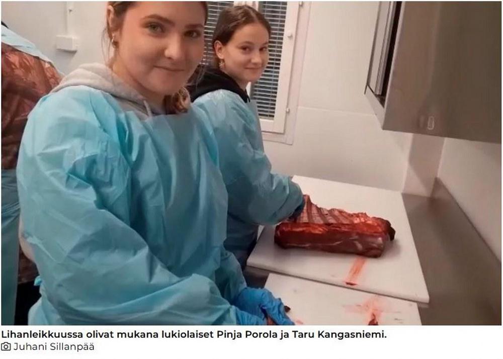Ruoveden Metsästysseuran syksyn viimeinen kaadettu hirvi paloiteltiin riistankäsittelytilassa keskiviikkona 26. marraskuuta. Lihan leikkaamisen harjoittelemista kaksi lukion eläinlääkinnän linjalla olevaa opiskelijaa. Mukana olivat Nokialta kotoisin oleva Pinja Porola ja Haapavedeltä kotoisin oleva Taru Kangasniemi. Molemmat olivat mukana jo aiemmin syksyllä metsästysseuran mukana lihanpaloittelussa.